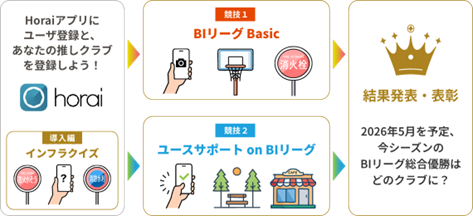今期のバスケインフラリーグは、導入編である「インフラクイズ」と「BIリーグ Basic」と「ユースサポート on BIリーグ」という二つの競技で構成され、エリアマネジメントアプリ「Horai(scheme verge株式会社※1開発・提供)」を活用して実施いたします。