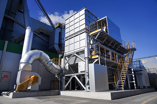 前田道路のアスファルト混合物製造工場(合材工場)では、混合物製造時に発生する臭いを気にされる周辺地域への配慮として、一部の工場に臭気を抑制するための脱臭炉を設置し対策をしています。直接燃焼式と蓄熱燃焼式の2種類があり、いずれも骨材の加熱乾燥時の排気ガスを高温で熱処理して臭気を抑えています。