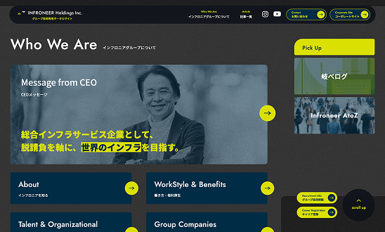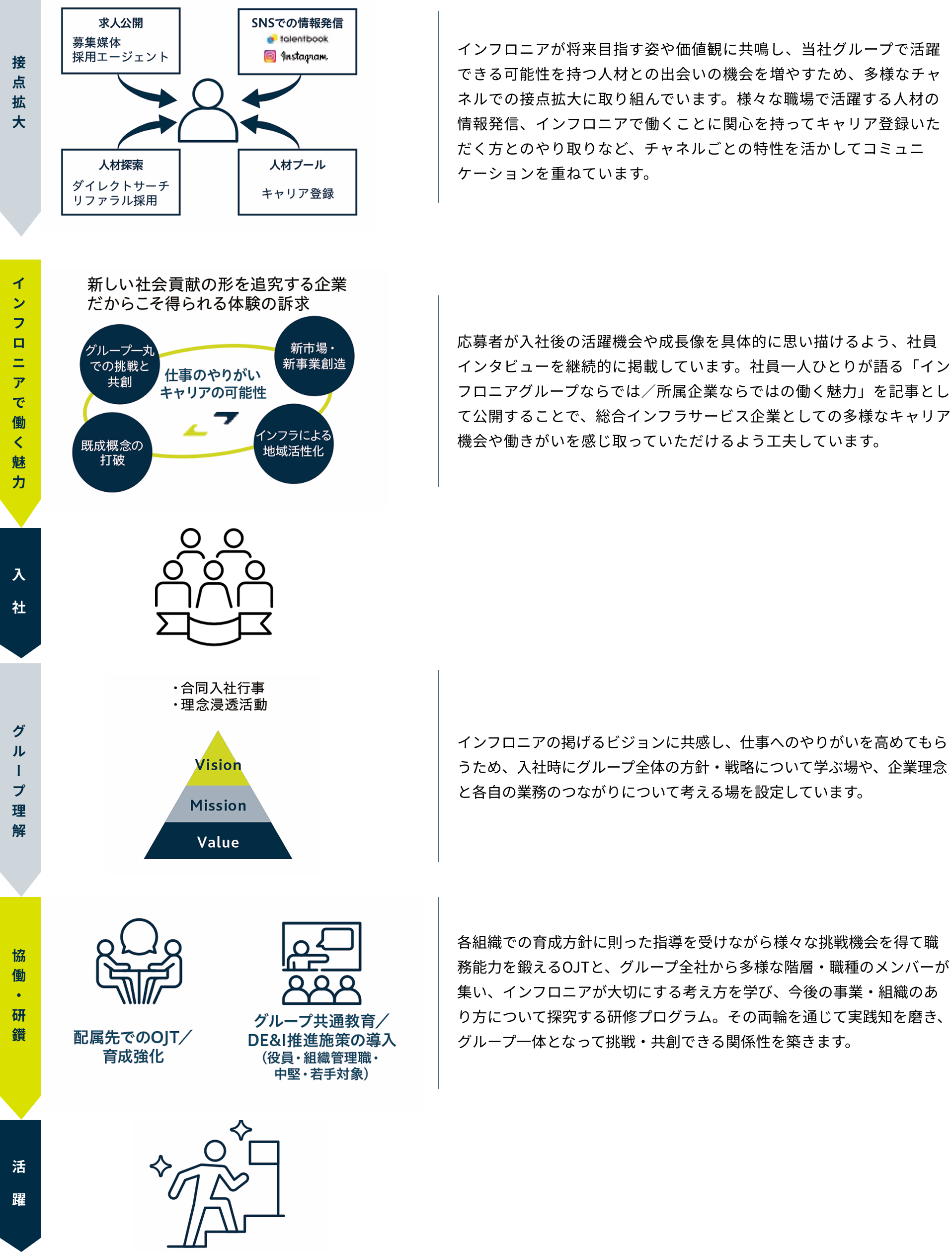 総合インフラサービス企業として新しい価値創造の実現を共に目指す人材を確保していくためには、インフロニアへの理解を深めるための採用プロセスが不可欠です。そのため、グループ採用ホームページをポータルと位置づけて、インフロニアグループの企業理念・行動指針・戦略・独自の強み・ビジネスモデルを体系的に掲載するとともに、SNSで発信するインフロニアパーソンの体験談や採用情報との接続を強化しています。これらの情報発信においては、「建築・土木・舗装・機械・再生可能エネルギー・インフラ運営といった多様な事業領域における専門性を磨き、掛け合わせて新たな価値を生み出すこと」や、「現状のあり方に疑問を持ち、様々な障壁を乗り越えて新たな枠組みを生み出す意志と行動を貫くこと」に挑戦し続ける当社独自の事業活動と、そのような組織文化のもとで働く従業員のリアルな日常を伝えることに力を入れています。また、キャリア登録者とのカジュアル面談や従業員の紹介によるリファラル採用など、当社に関心をお持ちいただいた方との接点において個々人の志向性を踏まえたコミュニケーションを重視し、インフロニアが大切にする価値観や募集ポジションの要件にフィットした人材の採用につなげています。