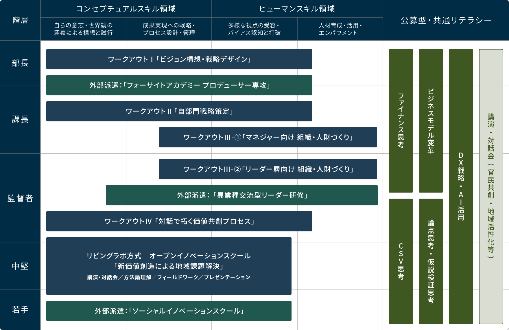 管理職の意識改革により会社変革・成長を加速させる重要な役割を果たせるリーダーの育成を目的としてグループ討議・ロールプレイングを活用した参加参画方式。期間は3年間 |