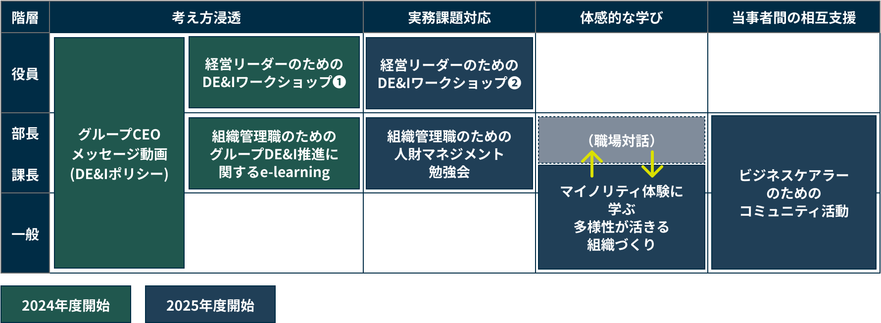 経営ビジョン実現には、従業員の多様な強みを活かして創発的な活動を立ち上げることが求められます。新中期経営計画期間には以下のねらいを掲げてグループ共通の教育体系・DE&I推進施策を導入します。